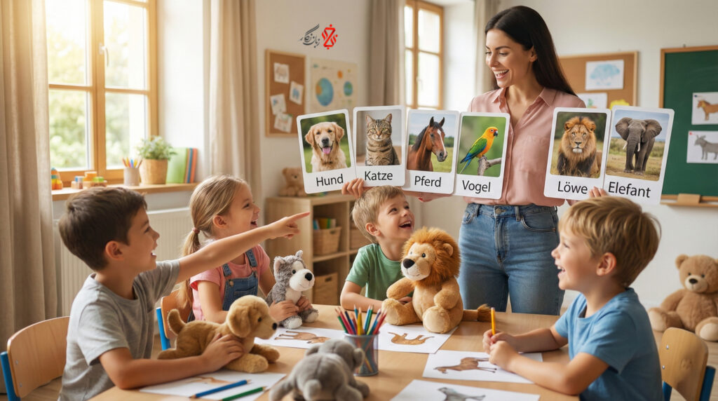 | 🃏 استفاده از فلش کارت | فلش کارتها به کودک کمک میکنند لغت و تصویر مرتبط را سریع به ذهن بسپارند. | کارت با تصویر و نام حیوان: Hund 🐶؛ کودک کارت را میبیند و نام میگوید. |